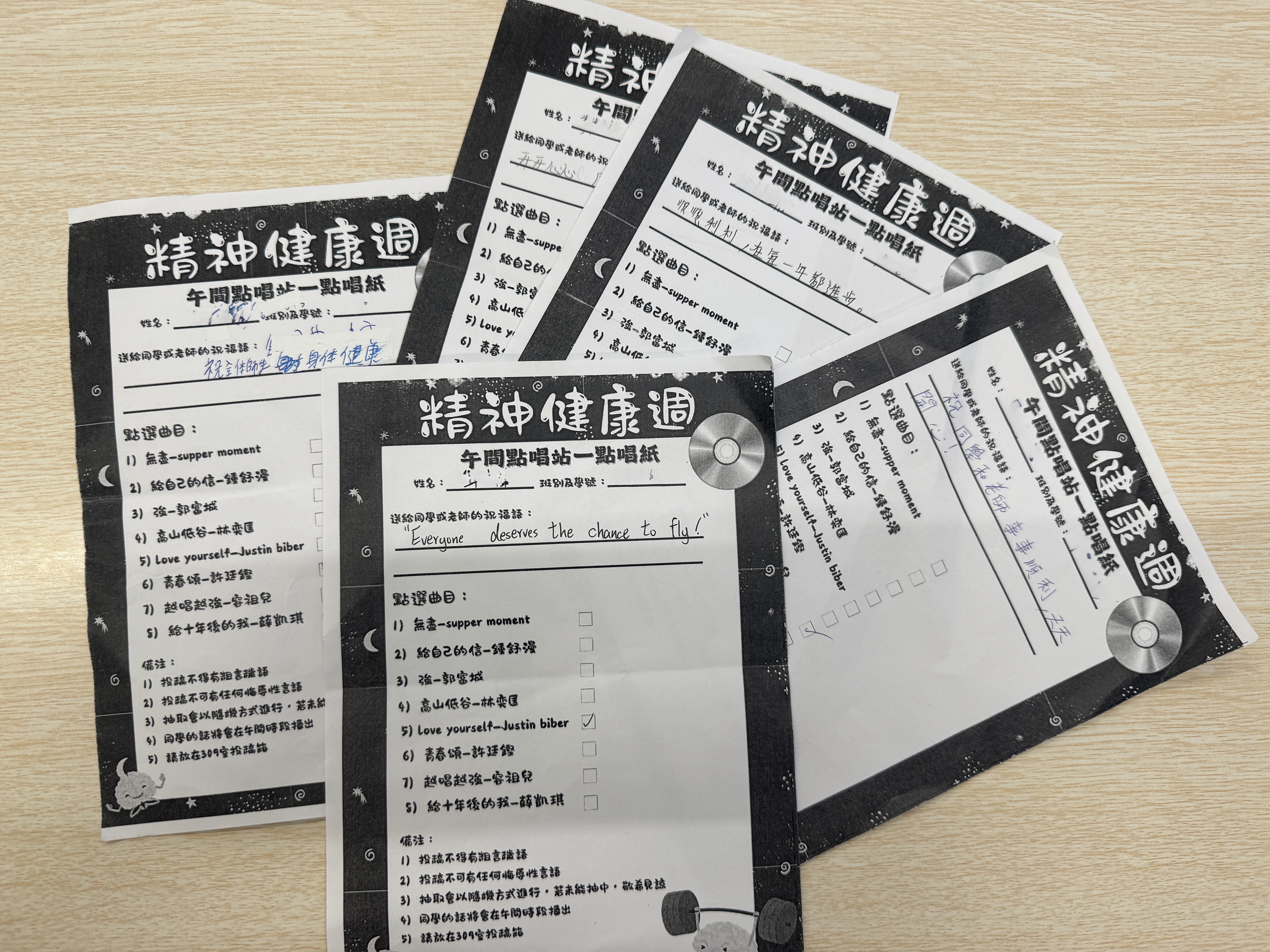 21-24 Oct 2025: Each lunch break, the host will broadcast several blessings and messages written by students on the song request forms, followed by playing the selected songs. This aims to encourage students to express their feelings and support each other, providing a relaxing emotional outlet.