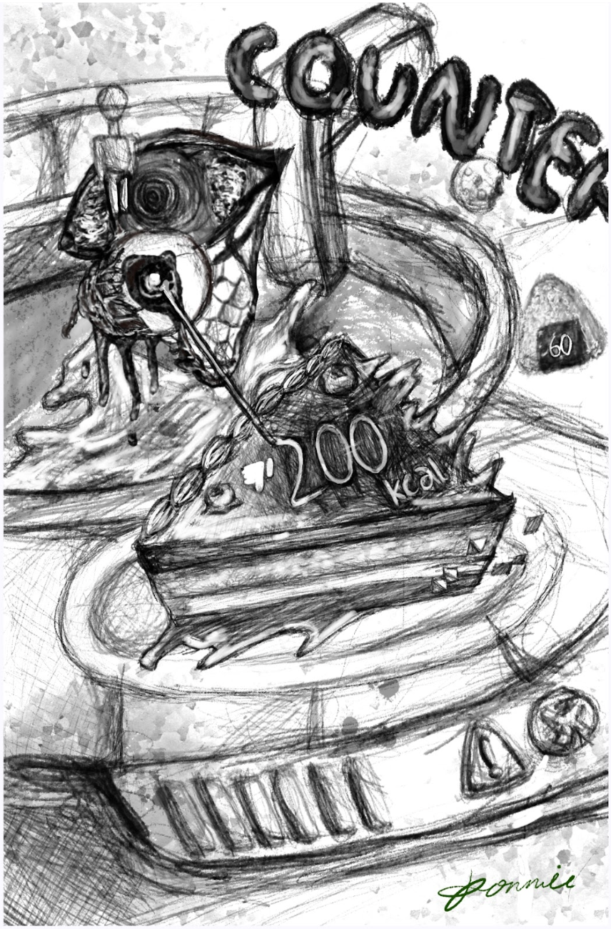 This artwork explores the complicated relationship between people with eating disorders and food. It reflects how social pressure can distort the way we see ourselves and what we eat. The chaotic composition represents the emotional cycle between binge eating and obsessively counting calories. In this world, food isn't something that nourishes — it becomes a source of anxiety.