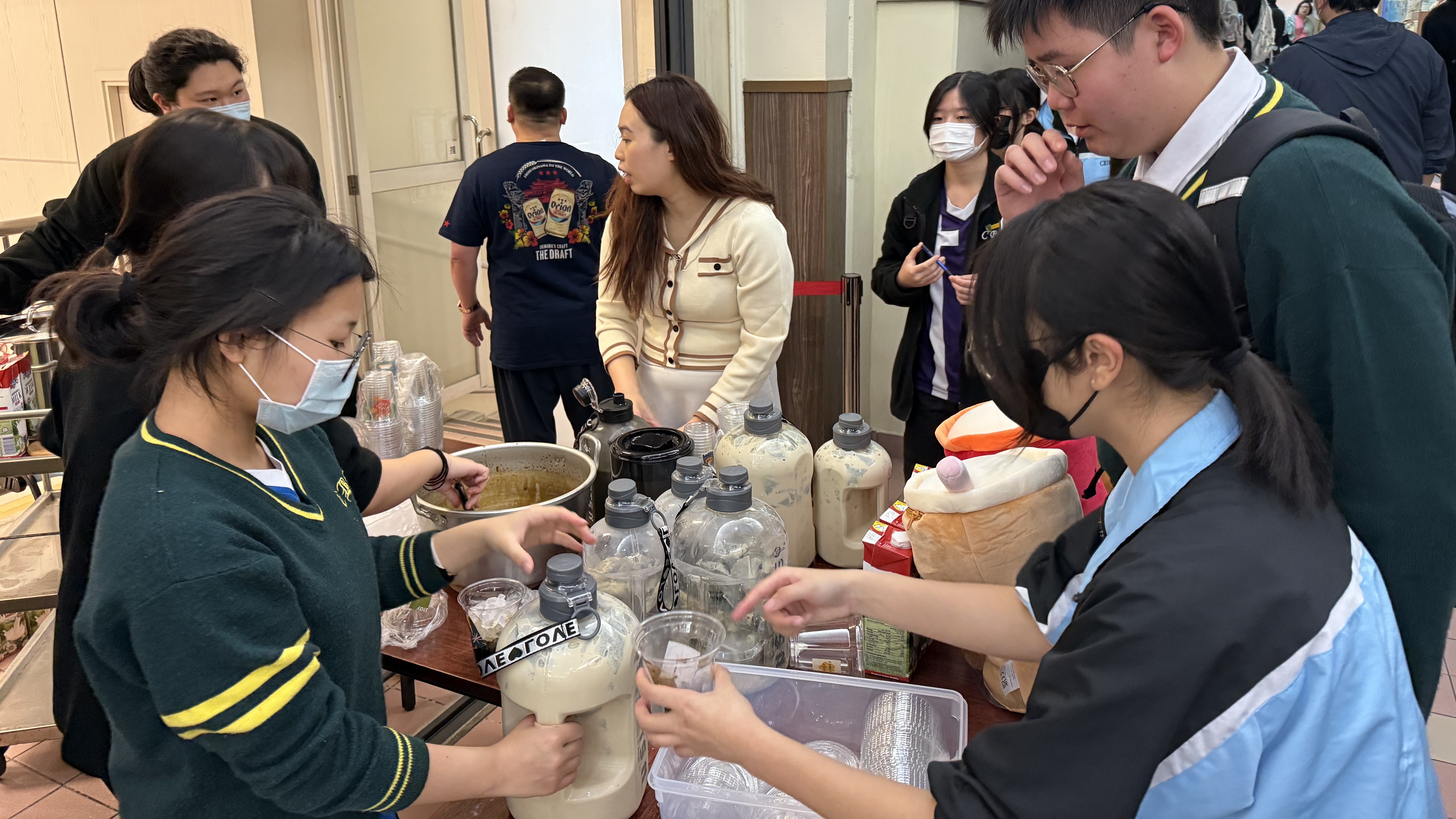 The committee members worked together to distribute drinks to the Form 1 students who were having their lunch.