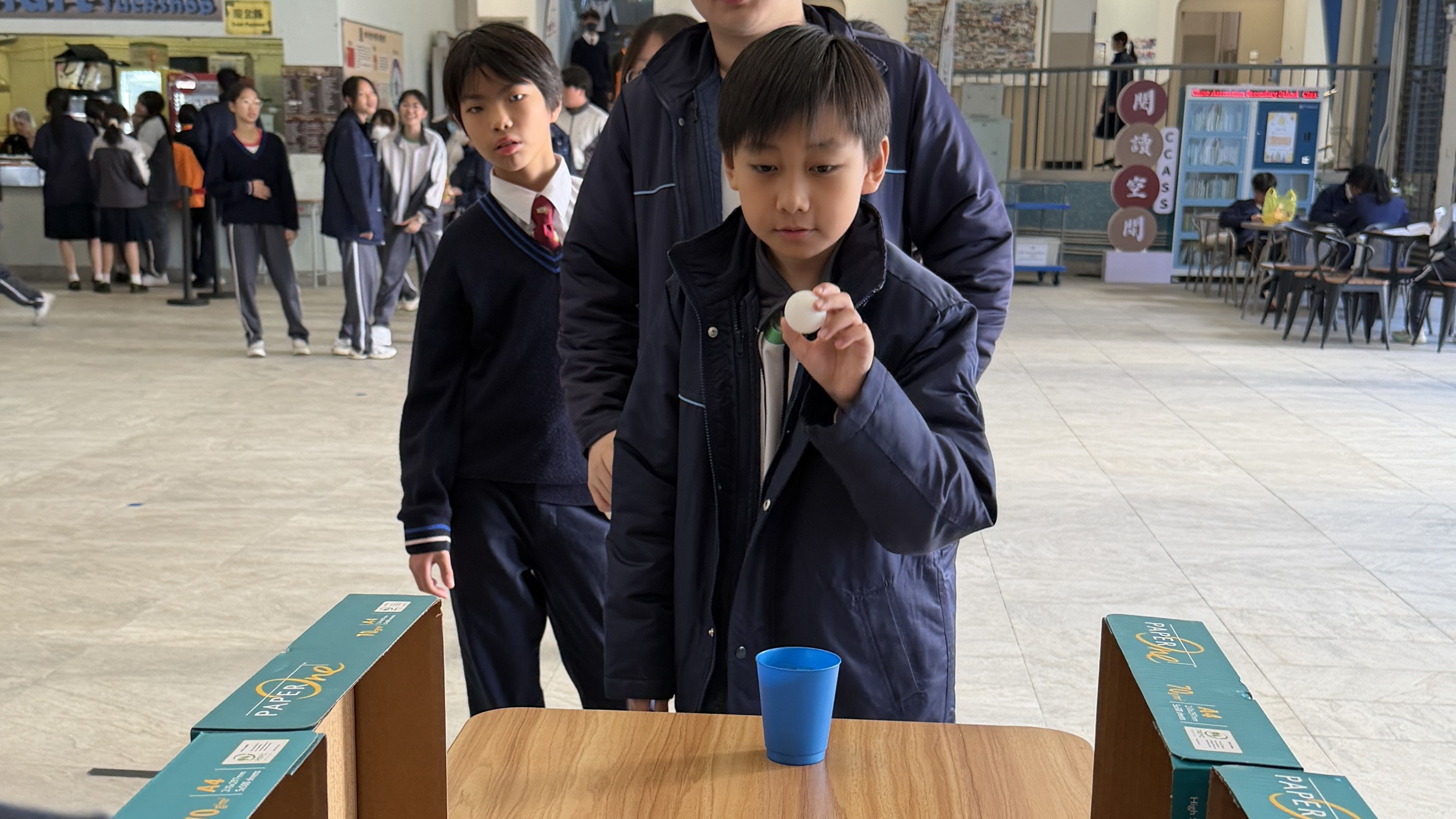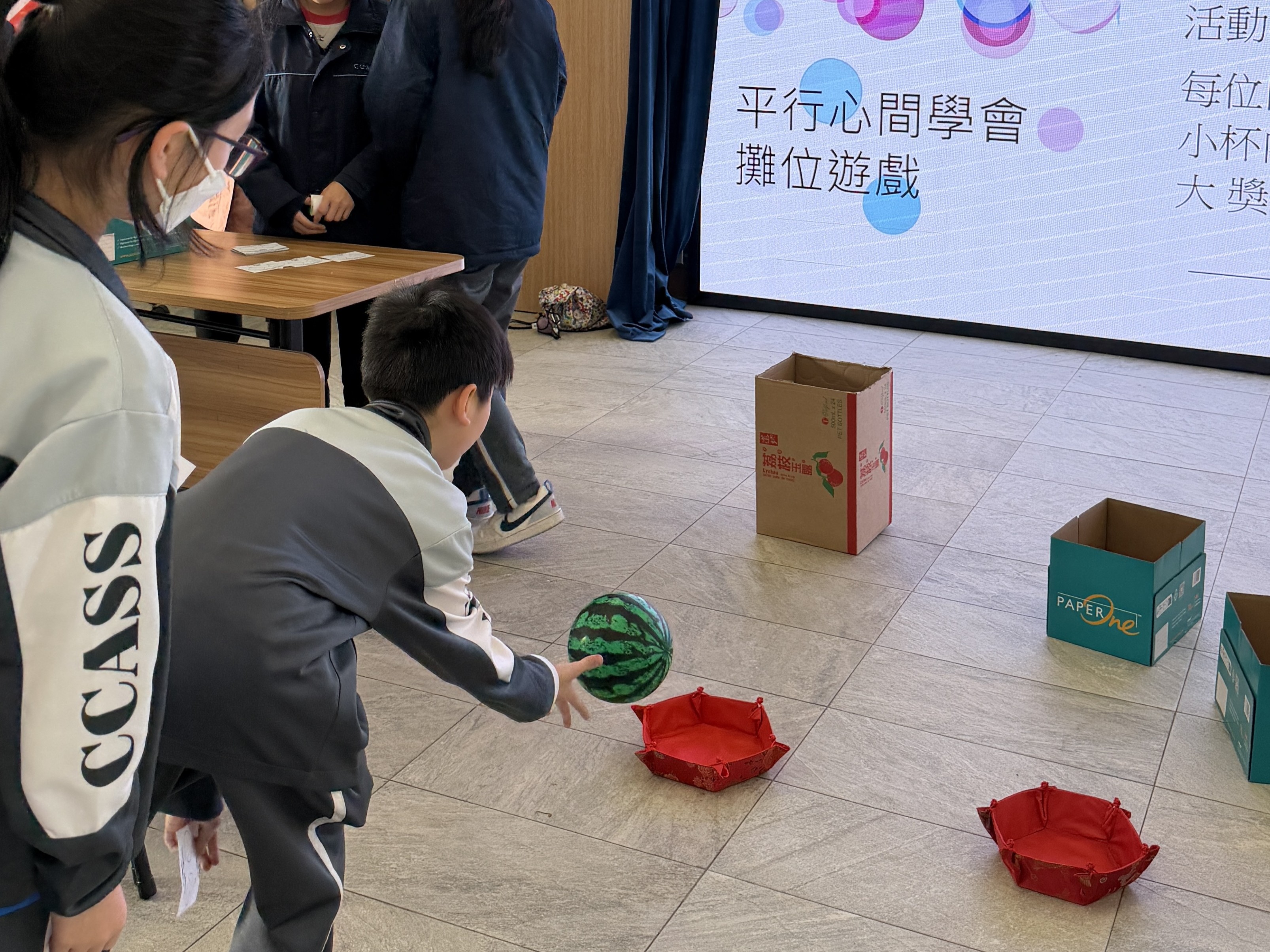 In Activity 1, each student was given a table tennis ball, a shuttlecock, and a big plastic ball, and challenged to toss them into baskets of different sizes. Through this game, students practised staying focused and calm, and learned that “it’s okay to try again after failing.” Many students were fully engaged and able to concentrate on the activity, enjoying the process rather than the result.