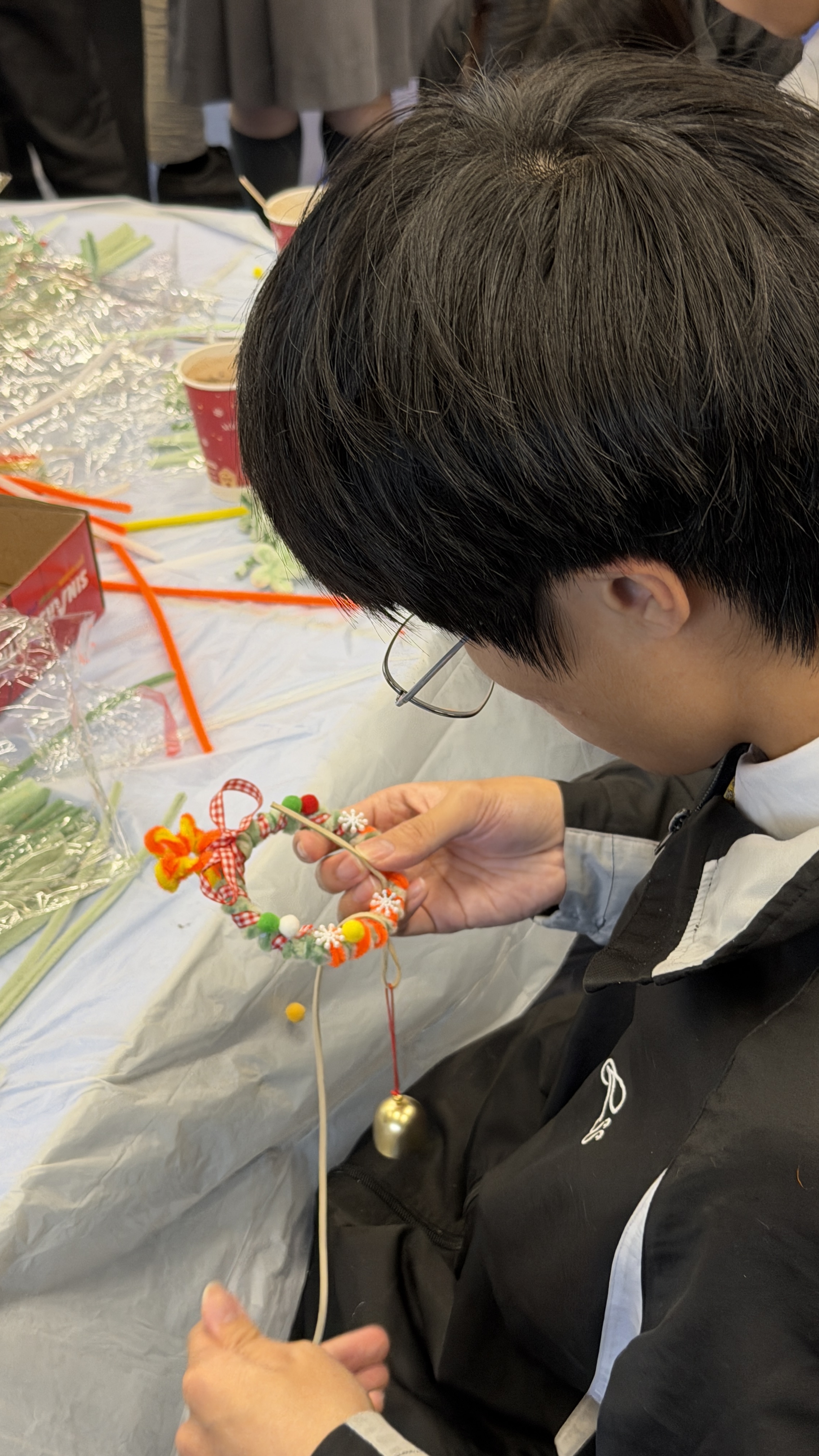 Students freely chose to make either wreaths or mini Christmas trees. Student leaders led groups, demonstrating and assisting with the process. Although the process was more complex and time-consuming than expected, the students were very engaged, focused on their creations, and exchanged ideas and helped each other. This period was not only an experience of artistic creation but also an opportunity for everyone to "focus on the present moment and release stress," experiencing the importance of rest and relaxation.