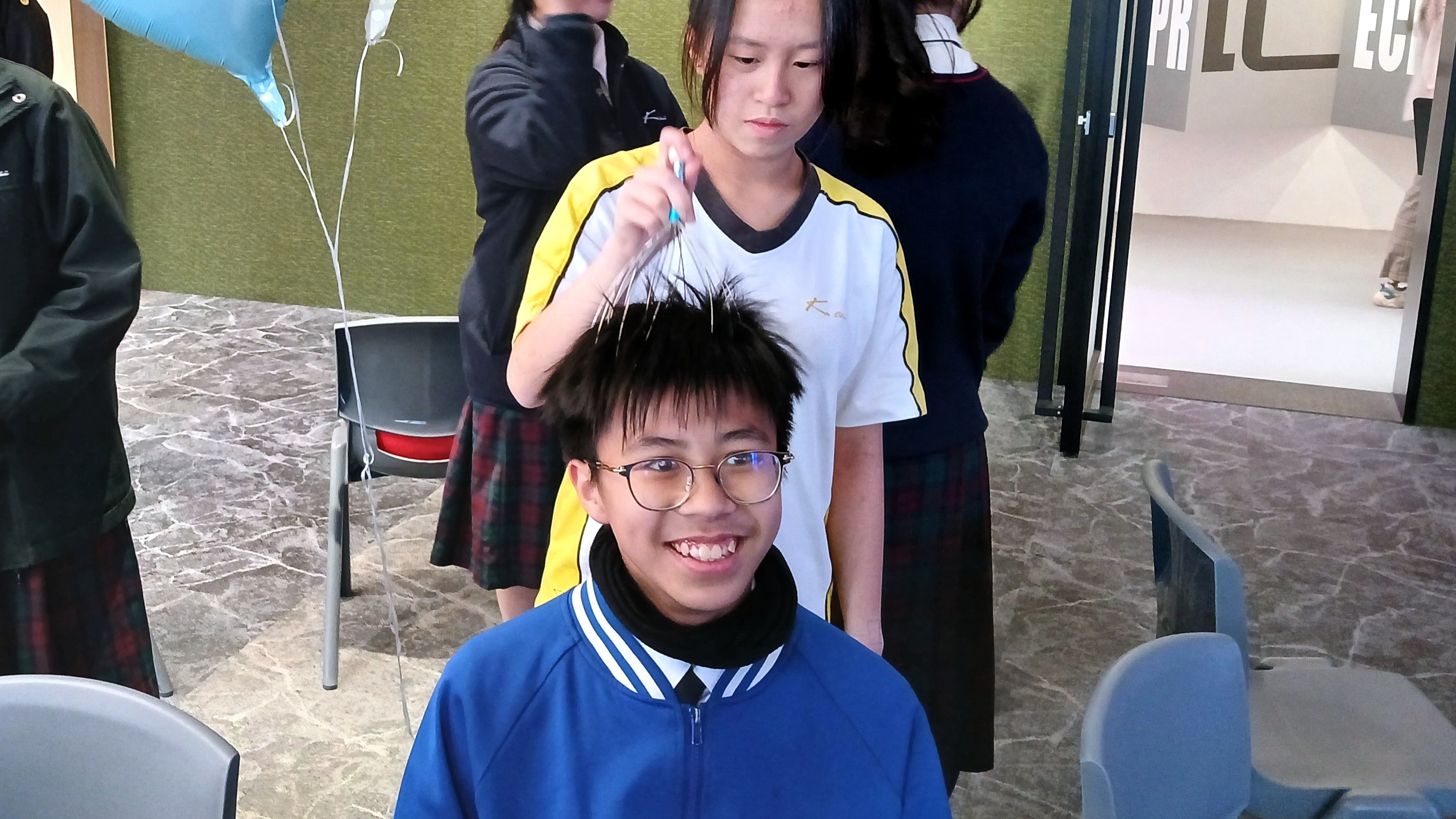 在本節活動中,同學坐在櫈子上享受著活動人員利用頭皮按摩器幫他們進行頭皮按摩。透過按摩器刺激頭部,讓頭部鬆一鬆,使同學即時感到快感,並笑一笑。